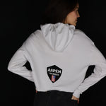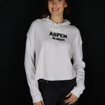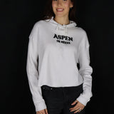 The design features the name "Aspen" in sleek, bold lettering, carefully printed on the front of the white hoodie. The print stands out with sophistication, adding a distinctive touch to the overall design. The white color of the hoodie reflects a modern and clean look.
