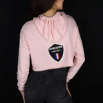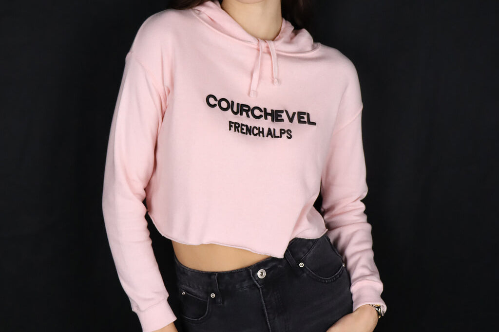 The design showcases the name "Courchevel" in bold, stylized lettering, prominently displayed on the front of the hoodie. The print is strategically placed to encapsulate the city's essence and impart a distinctive touch to the overall design. The pink backdrop of the hoodie brings a sophisticated and modern contrast, enhancing the print even further.
