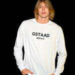 The white Long Sleeve T-Shirt features the name "Gstaad" in stylish lettering printed on the front. The clean, minimalist design highlights the beauty and sophistication of this famous alpine city. The white color of the T-Shirt provides a fresh and bright feel, perfect for sunny days and cool nights in Gstaad.