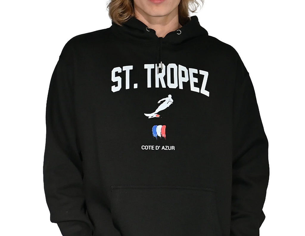 The exclusive design features the name "Saint Tropez" in bold and sophisticated lettering, carefully printed on the front of the hoodie. The print stands out elegantly, adding a distinctive touch to the overall design. The hoodie's black background creates an attractive, modern contrast, further enhancing the print and evoking an atmosphere of laid-back luxury.